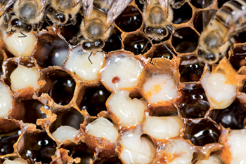 Au centre, un varroa s’attaque à une larve